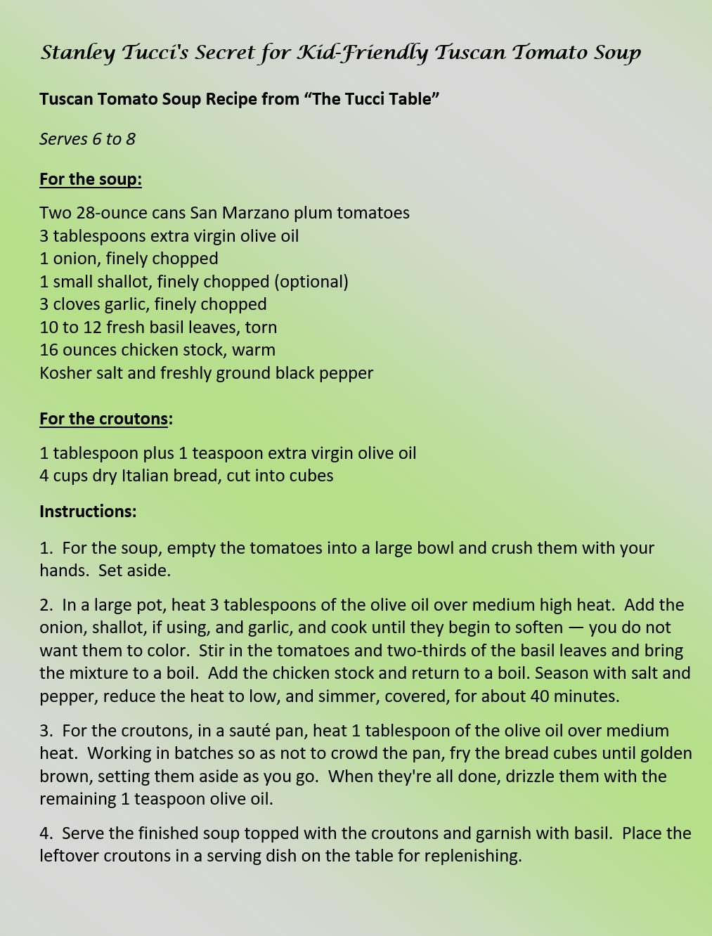 Tucci's Secret for Kid-Friendly Tuscan Tomato Soup Jan 1 Written By Susie Christiansen Try out Stanley Tucci’s kid-friendly Tuscan Tomato Soup! Susie Christiansen
